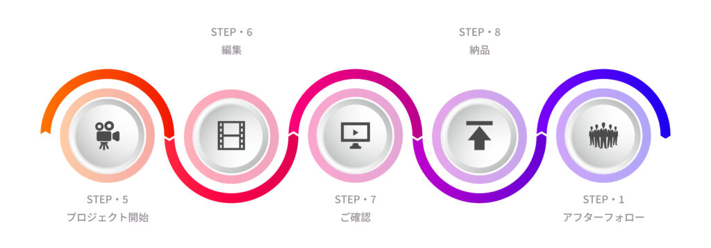 動画の長さや内容、撮影の有無などにより異なりますが、一般的には企画から納品まで約1〜2ヶ月を目安にしております。緊急の場合でも対応可能な場合がありますので、お気軽にご相談ください。