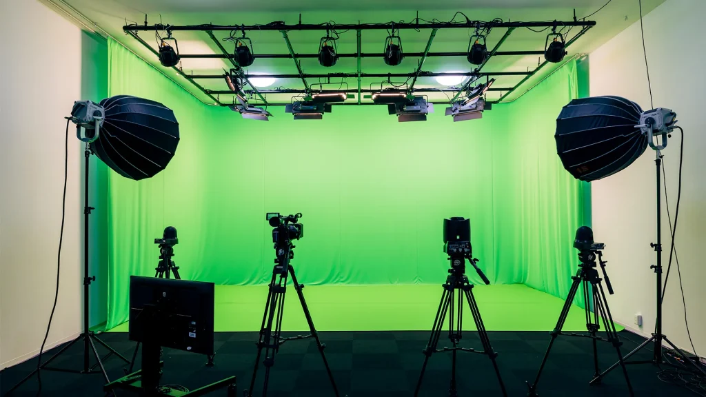 4台のカメラ(PTZカメラ3台、XDCAM1台)が常設され、スイッチャーを通じて映像と音声の同時収録が常に可能です。高品質な収録を必要とするプロジェクトに最適です。 - バーチャル撮影と多様な背景対応